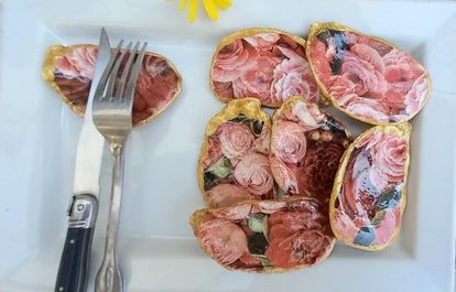 Ces porte-couteaux à thème maritime en coquilles d'huître s'inscrivent dans deux univers distincts. D'un côté, ils rendent hommageau printemps. De l'autre, l'arrière de la coquille dorée peut être utilisé lors des célébrations...