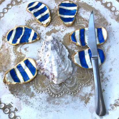 Ces supports à couteaux inspirés du thème marin en coquilles d'huîtres appartiennent à deux mondes différents. D'une part, ils rappellent les marinières que portaient les pêcheurs. Par ailleurs, le dos de la coquille dorée peut servir lors des festivités...