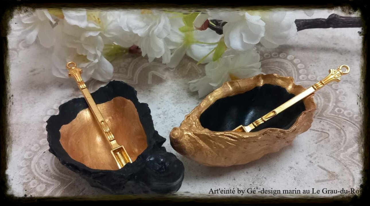 Sublimez vos repas avec ce set poivre et sel façonné à partir de véritables coquilles d’huîtres, métamorphosées en écrins précieux. Les nuances profondes du noir se marient à l’éclat raffiné de l’or pour offrir une pièce unique, à la fois décorative et fonctionnelle. Chaque duo est une ode à la mer et à l’artisanat, transformant un geste quotidien en rituel élégant. Idéal pour une table festive ou pour offrir un cadeau qui allie authenticité et raffinement.