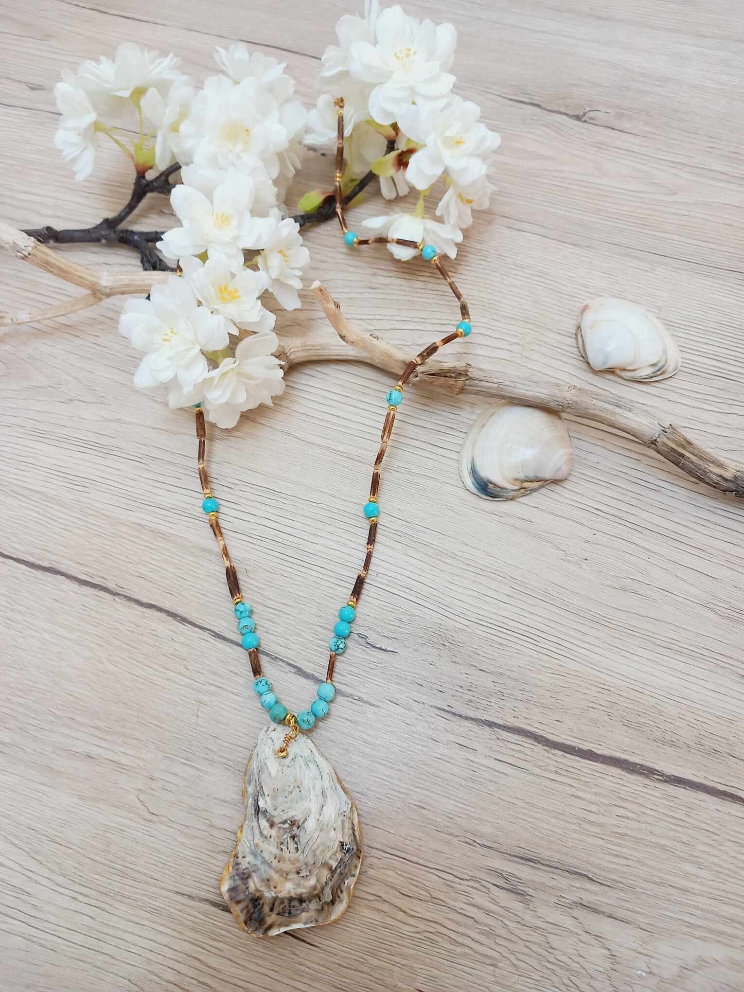 Collier artisanal mettant en valeur une coquille d'huître, perles de bois et perles turquoises (longueur de l'attache 35 cm)