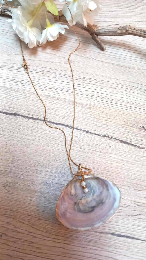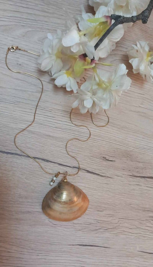 chaine plaquée or avec pendentif coquillage doré agrémenté d'une petite breloque de perles nacrées blanches