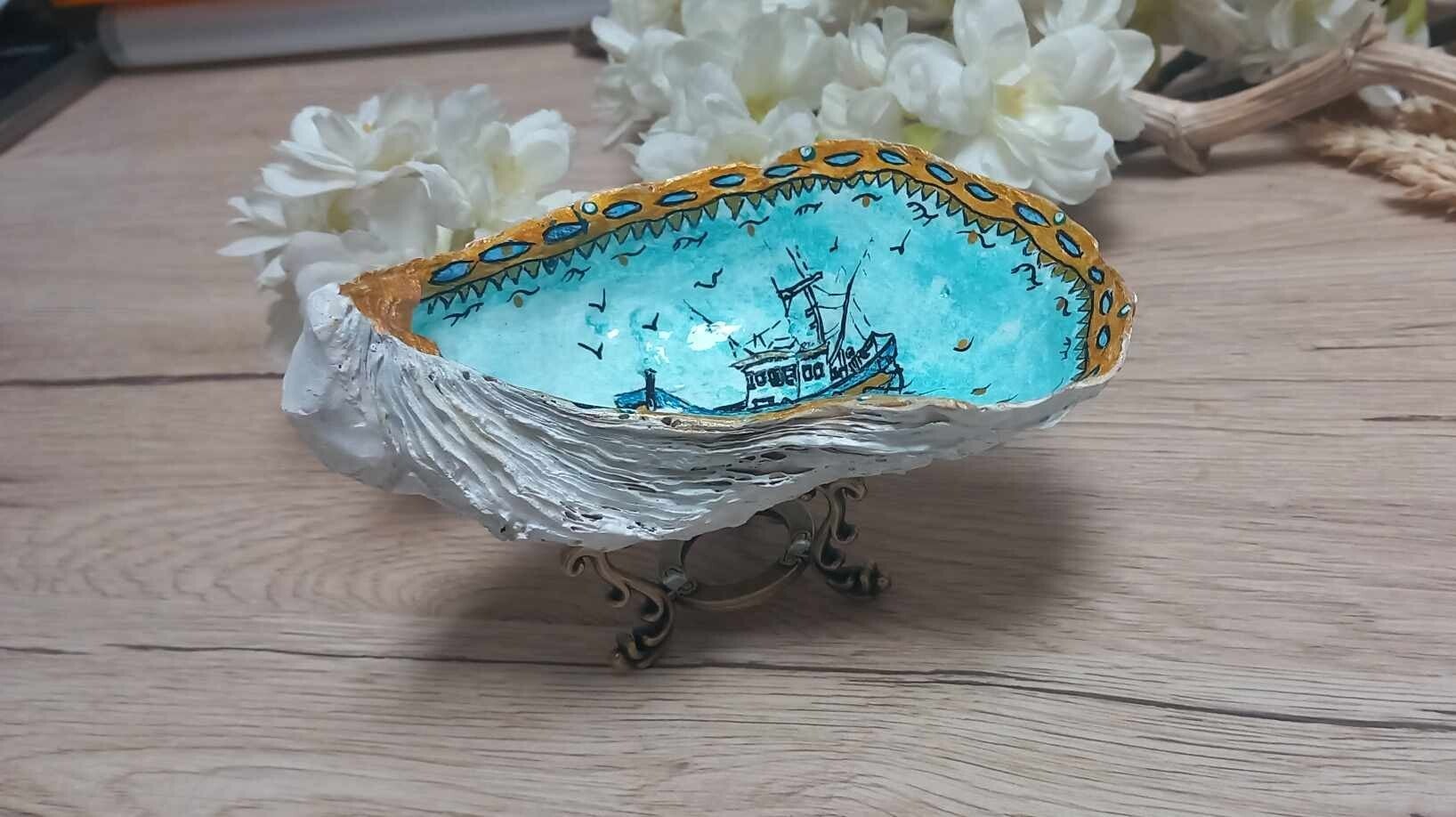 Porte-bijoux artisanal en coquille d’huître peinte – bateau de pêche création singulière du Grau-du-Roi