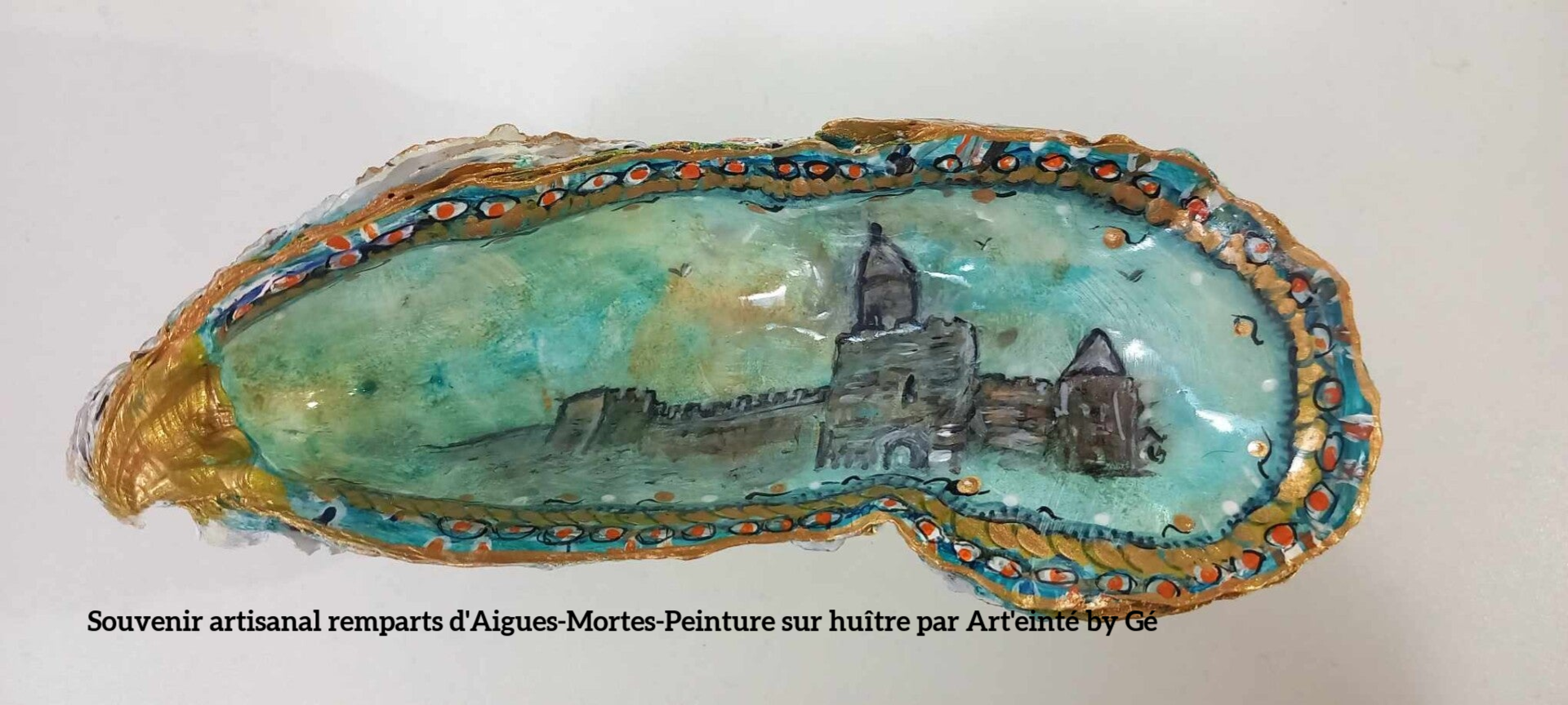 Grande coquille d’huître peinte – Les Remparts d’Aigues-Mortes | Art’einté by Gé